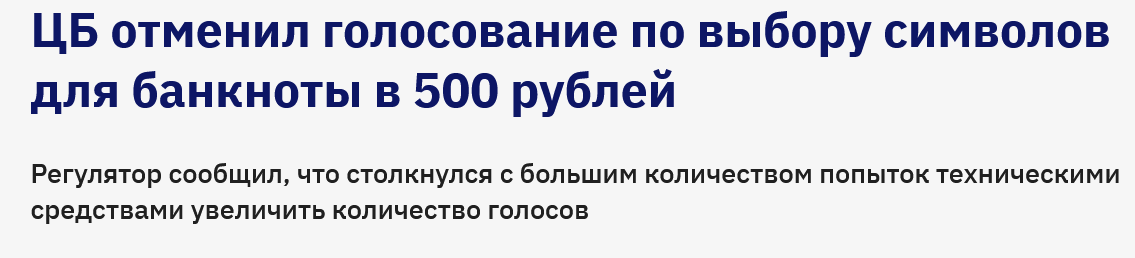 Центробанк решил провести голосование за символы для новой 500-рублевой купюры, посвященной Пятигорску и Северо-Кавказскому федеральному округу. Голосование проводилось на сайте, при этом разрешалось использовать аккаунты из российских соцсетей.
