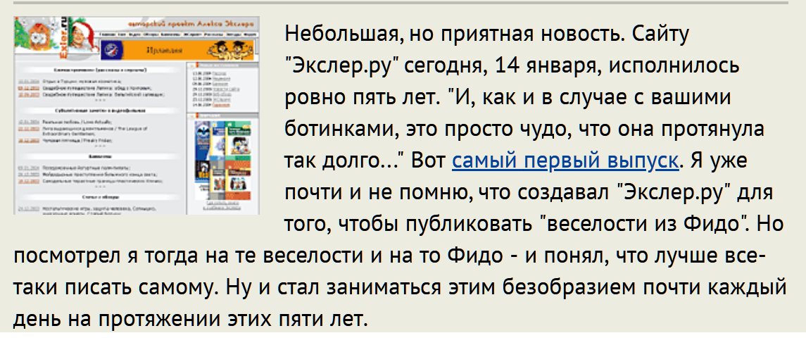 Я уже писал, что как-то виртуально познакомился с Вами еще до этого сайта, со времен PVT.EXLER, по наводке кого-то из моих пойнтов, который попросил протащить эту эху от аплинка (интересно, сколько людей сейчас поймут значение этих странных слов...). В общем, много-много лет назад.