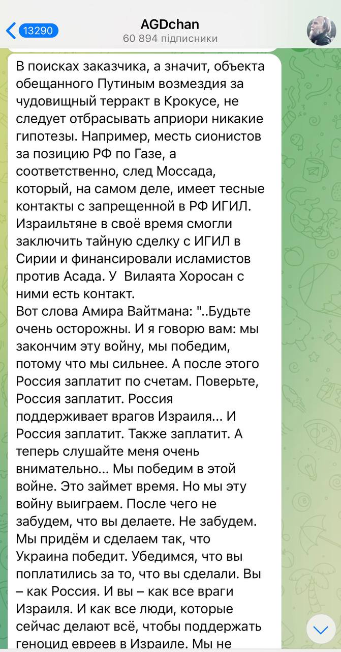 Ранее он заявил, что заказчика пока не установили, но в ФСБ видят, кто организовывал нападение и вербовал исполнителей. По его словам, теракт был выгоден западным спецслужбам и Украине, чтобы раскачать ситуацию в России и посеять панику в обществе."