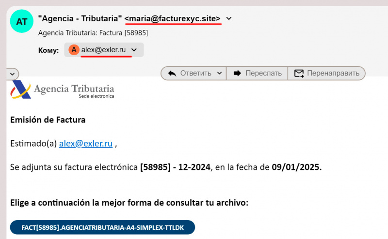 Я тоже сегодня вот такое получил. Но сердце тревожно не забилось. Потому что Штирлица выдавал не только парашют, который за ним тянулся по асфальту. Посмотрите на адрес - они даже не стали подделывать реальный адрес Agencia, что сделать совершенно элементарно в любом почтовом клиенте. Также поле "кому" - ни одно официальное учреждение в Испании меня не знает по адресу на @exler.ru, я для этого всегда использую специальный адрес на @gmail. (Я @gmail считаю самой надежной почтой, и у меня там, наверное, штук 12 адресов, которые я использую для различных целей - от тестовых до персональных.)