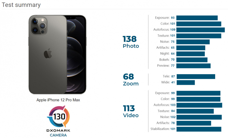Для оценки возможностей камеры iPhone 12 Pro Max эксперты DxOMark сделали свыше 3000 фотографий и отсняли более 2,5 часа видео. В список достоинств новинки вошли: быстрая и точная отработка автофокуса, точное определение экспозиции, приятный баланс белого в любых условиях съёмки, высокая детализация при хорошей освещённости, реалистичный цвет кожи на портретных фотографиях. Также в DxOMark высоко оценили алгоритм снижения цифрового шума и эффективную стабилизацию при видеосъёмке.