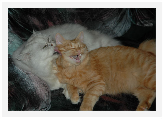 Забавная фотография получилась: Тоша решил лизнуть Анфису в ухо, а кошка в этот момент решила зевнуть...