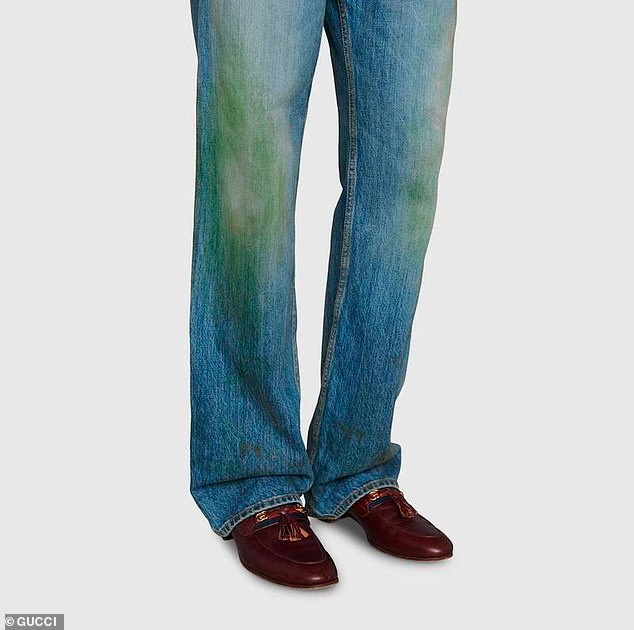Надевать платьишко предполагается на джинсы. Сами джинсы в "Гуччи" тоже могут предложить. Кроме традиционных рваных они предлагают еще и чудесный вариант с зелеными и коричневыми пятнами, как будто вы валялись в этих джинсах на заливных лугах, где перед этим какали бобры. Этот светлый взлет дизайнерской мысли заметно дешевле - всего 600 фунтов стерлингов.