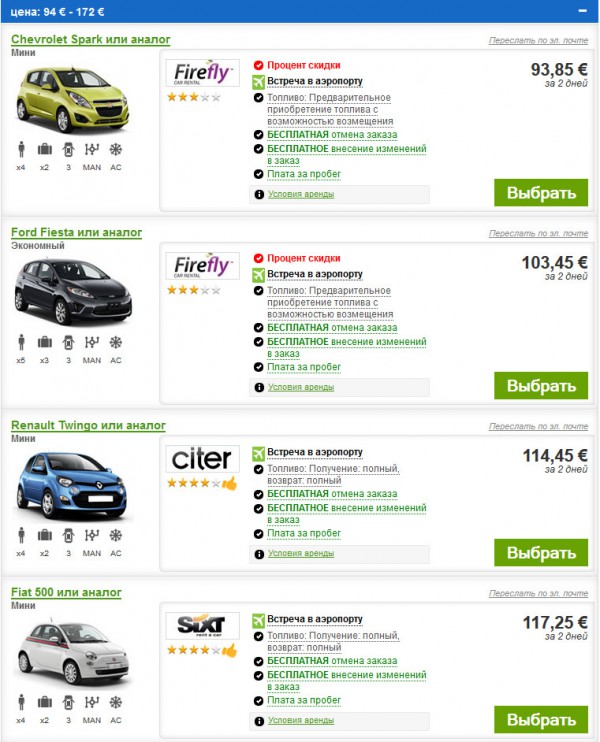 Далее остается нажать кнопку "Поиск автомобилей" - и сервис за несколько секунд представит вам самые выгодные предложения, перебрав практически все возможные прокатные компании (среди аж 550).
