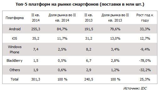 Поставки смартфонов на платформе Microsoft Windows Phone на мировой рынок во II квартале 2014 г. снизились на 9,4% до 7,4 млн штук по сравнению с 8,2 млн годом ранее. Это привело к сокращению доли с 3,4% до 2,5%, говорится в отчете IDC. (Отсюда.)