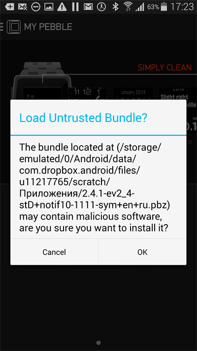 Я на этих часах (Pebble Steel) пару раз прошивку успешно обновил своей сгенерированной. А теперь, после того как на часах 2.4.1 - генерирую на Pebblebits прошивку, кидаю ее в Dropbox, из Dropbox на смартфоне загружаю, она открывается в приложении Pebble, задается ожидаемый вопрос, я нажимаю "ОК" - и все, ничего не происходит, просто открыто приложение Pebble.