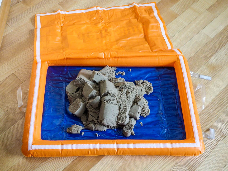 Работает это следующим образом. Кинетический песок в нужном количестве просто высыпается в песочницу.