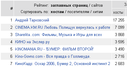 Сразу возникает вопрос: что за сайт "Андрей Тарковский", который занимает позицию Shareaktor? Обычный сайт, на который ходило 10-20 человек в день. Но когда Shareaktor выставили из рейтинга, он - вероятно, в знак протеста - стал направлять весь поток своих посетителей на этот сайт. И на него стало ходить 10-20 ТЫСЯЧ человек в день. Прикольно.