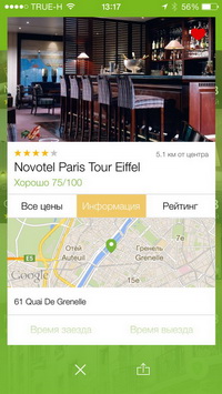 Приложение в режиме реального времени сравнивает цены на отели в ведущих системах онлайн–бронирования. Обычно поиск занимает не более 30 секунд. Далее появляется окно с найдеными отелями и ценами на них.