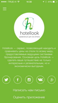 О Hotellook. Информация о приложении, ссылки на социальные сети. Возможность написать нам письмо или оценить приложение. Будем признательны за оценки!