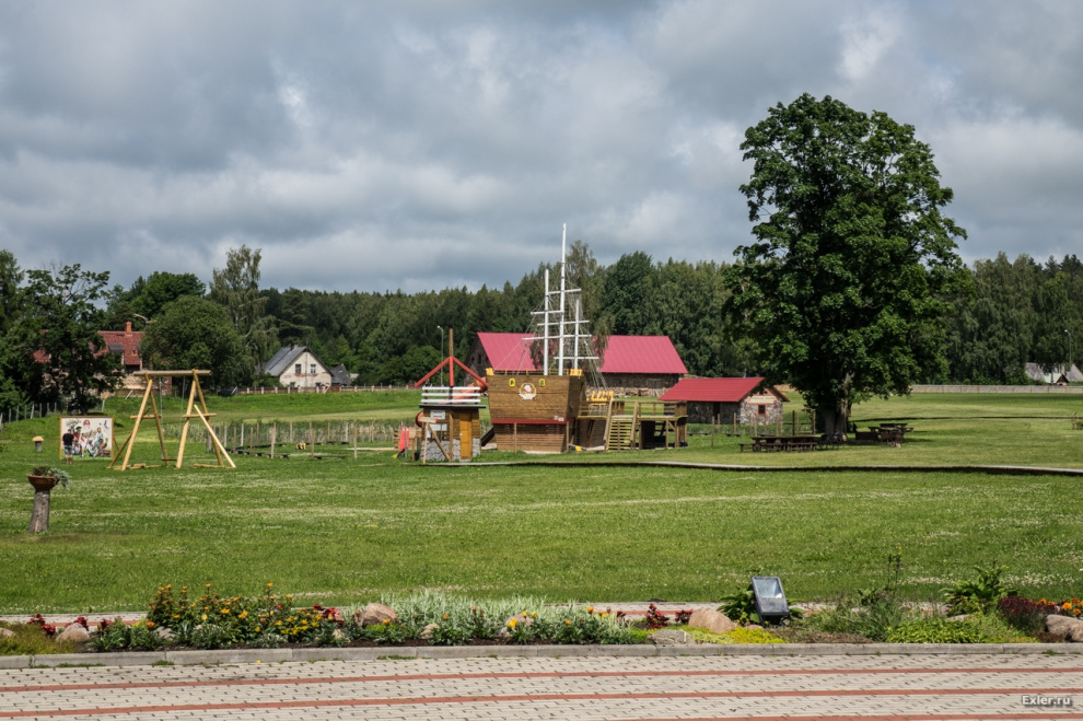 О "Музее Мюнхгаузена" я уже писал. Но это место интересно не только музеем-усадьбой. Там есть еще три развлечения: детская игровая площадка в виде здоровенного корабля, пятикилометровая туристическая тропа к морю (утверждается, что это чуть ли не лучшая туристическая тропа в Латвии), ну и Путь к Кружке, который вроде как с километр, но мой верный Fitbit показал, что там в одну сторону все два километра.