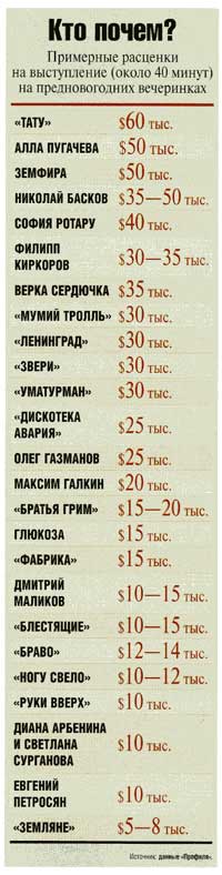 Только данные все-таки достаточно не совсем достоверные. Петросян точно стоит значительно дороже. Галкин - тоже. А вот Сердючка действительно подешевела с $70-100 прошлогодних тысяч до тридцатника - явно всех изрядно утомила.