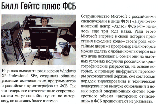"Предоставил "исходные коды" - своего рода потайные двери в программу..." - тоже полная укатайка. Это не потайные двери в программу. Это исходные коды, по которым определенные версии Windows сертифицировались Гостехкомиссией.