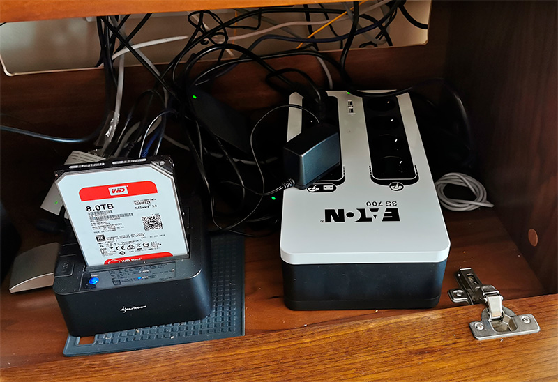 Пару дней это все проработало, а вчера утром NAS присылает сообщение о том, что ночью он вырубался из-за пропадания электричества. Что, думаю, за черт? Пошел к бесперебойнику. Выдернул его из розетки. NAS сразу вырубился, внешние диски работают. Дурдом какой-то.