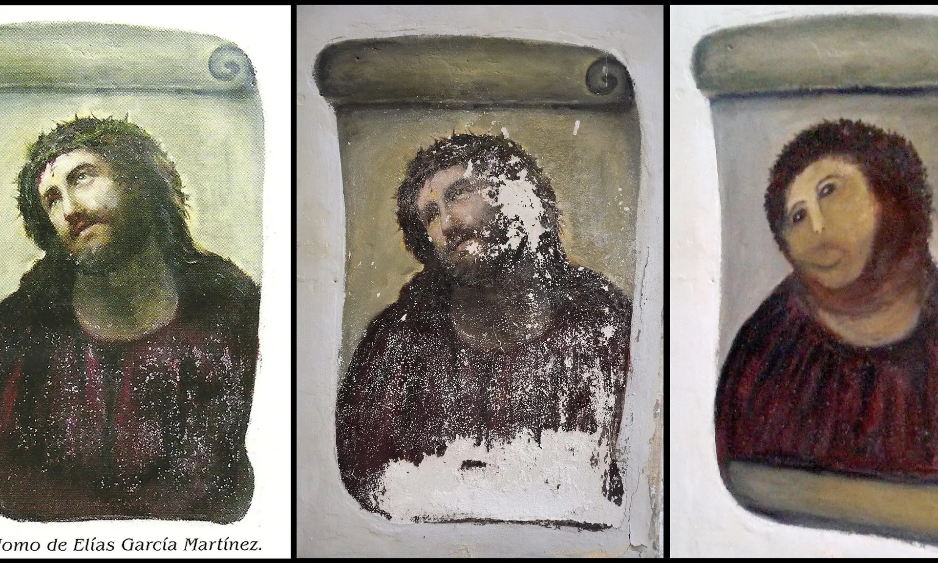 Помнится, в Испании как-то прихожанка церкви попыталась восстановить фреску с изображением Иисуса кисти Элиаса Гарсиа Мартинеса. Тоже получилось довольно живенько. Классно обновила, классно!