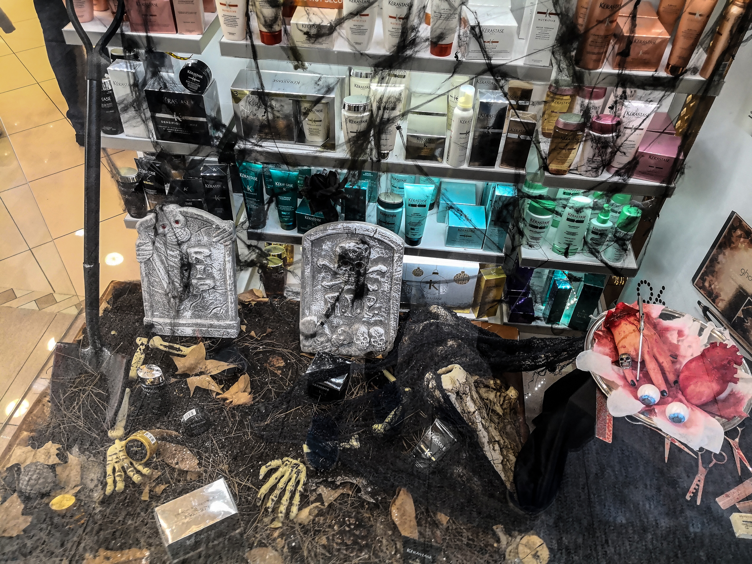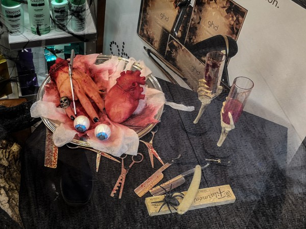 Отдельное развленчеие в Хэллоуин - разглядывать специально украшенные витрины. Вот, например, витрина местной парикмахерской.