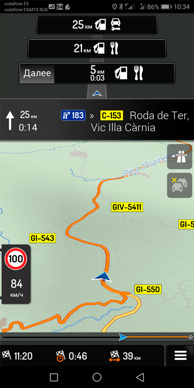 Ладно, выставил Бергу, едем дальше. Где-то напротив Монтсеррата заехали заправиться. Смотрю - программа выдает сообщение, что у нее под что-то там не хватает памяти (на смартфоне 6 ГБ оперативки и где-то 70 ГБ свободной встроенной памяти). Нажимаю на "ОК" - видно, что навигация сбросилась, ведения по маршруту нет.
