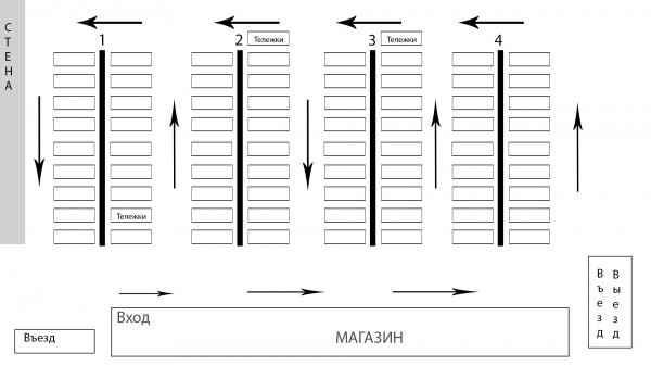 Въезда два, выезд один. Задача - выбрать оптимальное место для парковки с тем, чтобы как можно меньше крутиться туда-сюда, быть как можно ближе ко входу в магазин и не слишком далеко отвозить тележку. Тележка берется внутри магазазина, а потом ее надо оставить на специальном месте на парковке. Также еще нужно учесть, откуда въезжал.