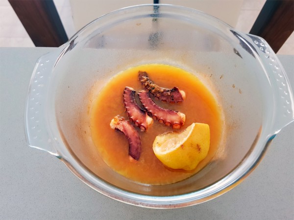 Одну порцию сделал в духовке. Щупальца осьминога, оливковое масло, полить соком лимона, кинуть лимон в кастрюльку, черный перец, сладкий красный перец, чуть-чуть кайенского перца и немного белого вина.