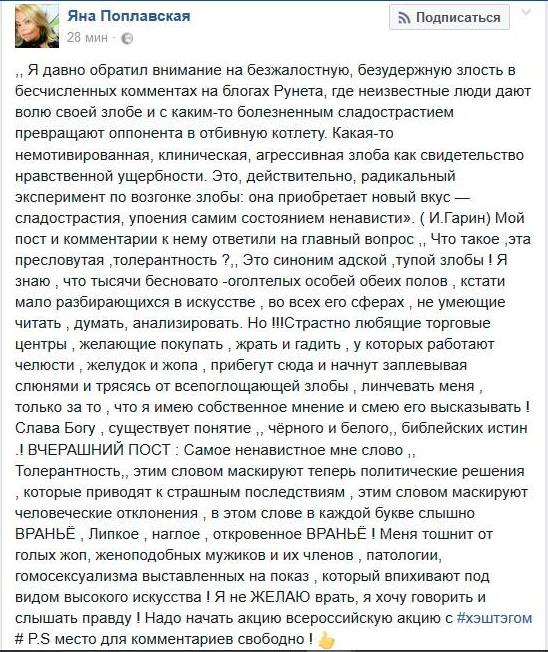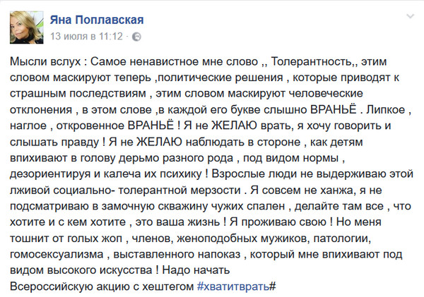 Так о чем она? А-а-а-а-а-а, так она об Омериге! Где негров линчуют и толерасты публично сношаются на площадях. Понял, понял. Ну, да, пора начинать публичную акцию #вывсеврети. Также Яну как-то надо избавлять от членов и голых жоп, переживает же человек. Эй, кто там Яне непрерывно голые жопы показывает? Немедленно убрать и прекратить! Вы что там вообще себе позволяете?!!