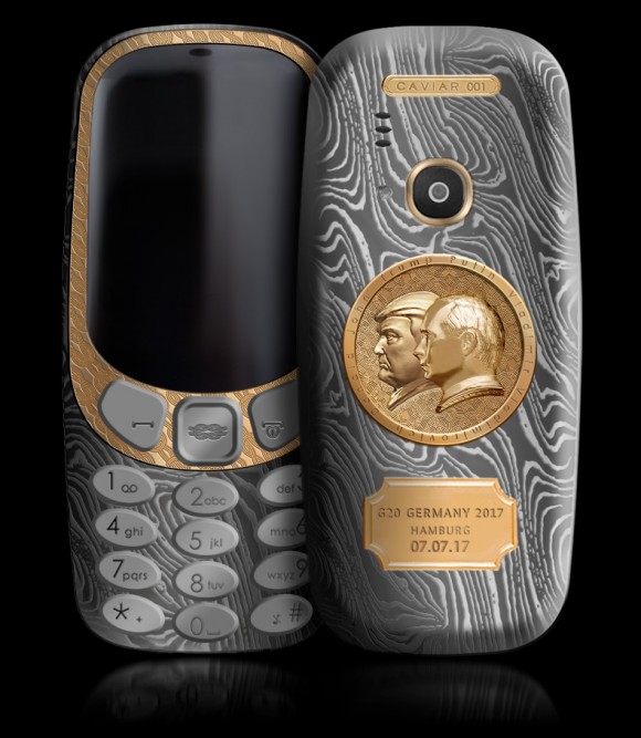 Российский производитель люксовых смартфонов Caviar, известный своими экстравагантными версиями iPhone, сообщил о выпуске Nokia 3310 в титановом корпусе с золотыми портретами Путина и Трампа. Релиз приурочен к встрече Владимира Путина и Дональда Трама на саммите G20, которая состоится в Гамбурге 7 июля.