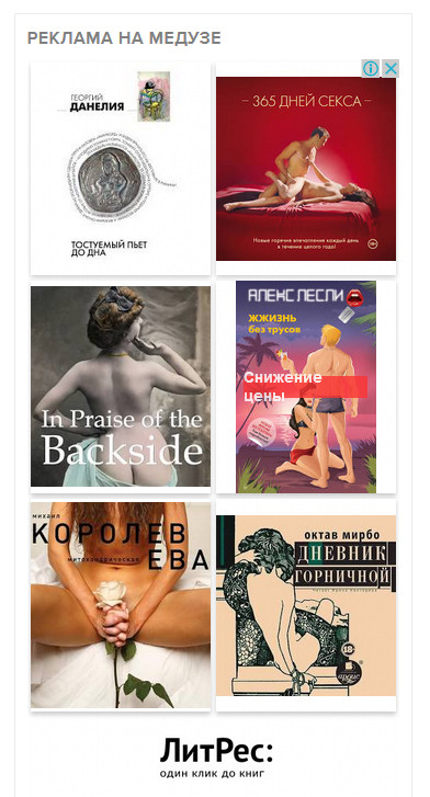 "Литрес" нынче в рекламной сети "Яндекса" рекламируется вот таким вот образом. Что, конечно же, многое говорит о рекламном отделе "Литреса" и об уровне модерирования рекламной сети Яндекса. Мне кажется, что они там все - совершенно охерели в конец. Еще и книгу Георгия Данелия среди всего этого дерьма вставили, молодцы какие!