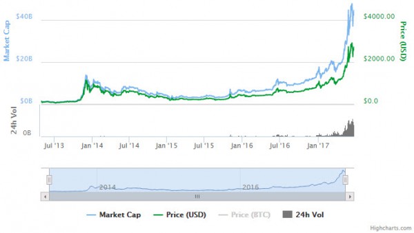 С начала 2017 г. по состоянию на 14 июня 2017 г. курс биткоина вырос почти на 200%, подорожав до 2761 долл. Казалось бы, вот он, идеальный инструмент для инвестирования — надежная валюта, которая только растет в цене (по мнению ряда аналитиков, в среднесрочной перспективе цена биткоина достигнет 10 000 долл.), недаром одни из самых популярных запросов в поисковых системах касаются именно вложений в биткоины.
