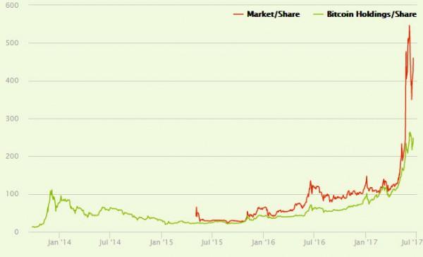Сейчас акции Bitcoin Investment Trust торгуются с премией к курсу биткоина.
