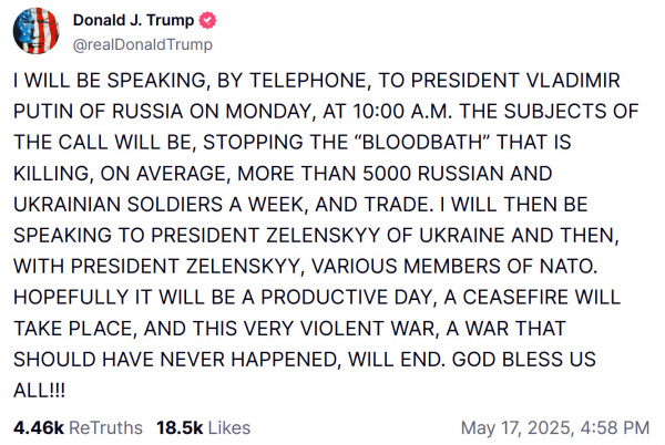 Только что завершил двухчасовой разговор с президентом России Владимиром Путиным. Считаю, что он прошел очень хорошо. Россия и Украина немедленно начнут переговоры о прекращении огня и, что еще более важно, о ПРЕКРАЩЕНИИ войны. Условия этого будут согласованы между двумя сторонами, как и должно быть, поскольку только они знают детали переговоров, о которых никто другой не может знать. Тон и дух разговора были отличными. Если бы это было не так, я бы сказал об этом сейчас, а не позже. Россия хочет вести крупномасштабную ТОРГОВЛЮ с Соединенными Штатами, когда эта катастрофическая «кровавая баня» закончится, и я согласен с этим. У России есть огромные возможности для создания огромного количества рабочих мест и богатства. Ее потенциал НЕОГРАНИЧЕН. Точно так же Украина может получить огромную выгоду от торговли в процессе восстановления своей страны. Переговоры между Россией и Украиной начнутся немедленно. Об этом я сообщил президенту Украины Владимиру Зеленскому, президенту Европейской комиссии Урсуле фон дер Ляйен, президенту Франции Эммануэлю Макрону, премьер-министру Италии Джорджии Мелони, канцлеру Германии Фридриху Мерцу и президенту Финляндии Александру Стаббу во время телефонного разговора со мной сразу после разговора с президентом Путиным. Ватикан в лице Папы Римского заявил, что был бы очень заинтересован в проведении переговоров. Да начнется процесс!