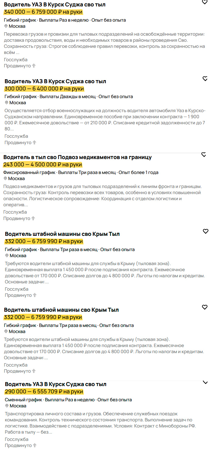 Смотрите, какие на Avito вакансии интересные. Водители нужны. На сывыо. В тыл, конечно, куда же еще? Примерно 300 тысяч в месяц, выплаты по 5-7 миллионов, но это, как я понимаю, если в тылу неудачно покурил. Что интересно вакансии пулеметчиков на сывыо - разумеется, в тот же тыл (в тылу пулеметчики - во как нужны), там те же 250-300 тысяч в месяц и выплаты 6-7 миллионов, если пулемет заклинит. На всех таких вакансиях адрес для обращения - Москва, ул. Яблочкова, 5с1. Там расположен какой-то учебный комбинат - видимо, там контракт и заключают.