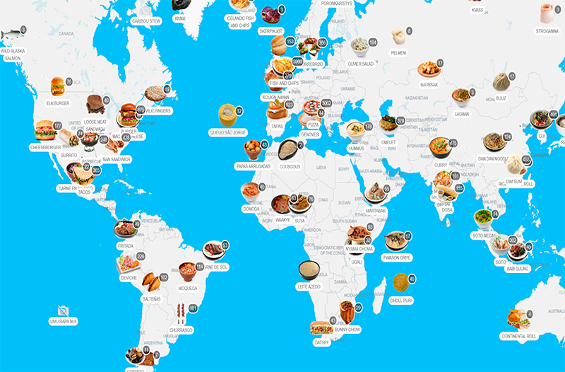 Карта масштабируется до определенного уровня, так что можно посмотреть основные блюда по регионам одной страны. Вот, например, часть Испании.