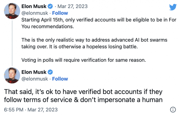 Глава Twitter Илон Маск объявил о том, что с 15 апреля в ленте рекомендаций Twitter будут показываться посты только верифицированных, то есть платных аккаунтов. Посты неверифицированных (бесплатных аккаунтов) в ленте показываться не будут вовсе. Также голосовать в опросах смогут только платные пользователи (цена вопроса - 7 долларов в месяц).