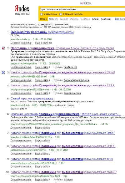 Сегодня искал в Яндексе "программы для видеомонтажа". Среди первой десятки выдачи - шесть (!) совершенно одинаковых галимых и кривых дорвеев, не имеющих никакого отношения к задаваемому вопросу - там только одна ссылка на кривой странице, которая ведет на уже убитый сайт.