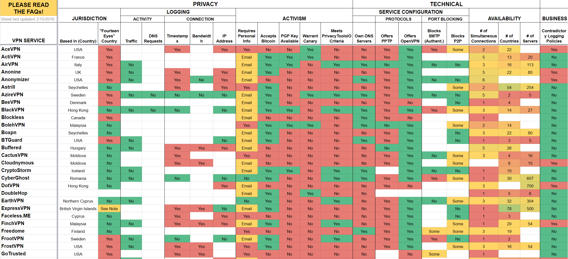 Пользователь Reddit под ником ThatOnePrivacyGuy первым провёл масштабное сравнение 125 популярных VPN-сервисов и занёс результаты своей работы в таблицу Google Docs. На его труд обратило внимание издание Lifehacker. (Отсюда.)
