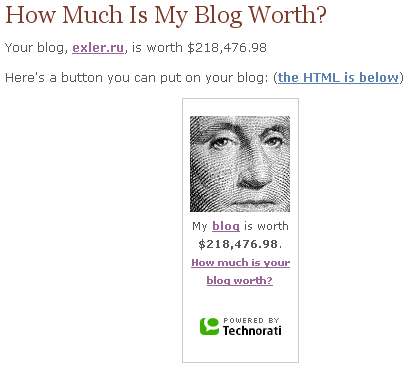 Вот здесь есть некий сервис, который, типа, определяет стоимость блогов. Вводите URL и, типа, определяете стоимость своего блога. Работает по непонятному принципу, но довольно забавно. Известные сайты, которые вообще не похожи на блоги - определяет в 0. Похожие на блоги - во что-то оценивает. Скажем, anekdot.ru оценил примерно в 100 тысяч долларов. Exler.ru оценил вот так: