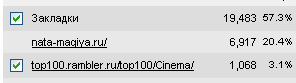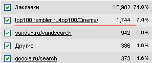 Блин, первое место в разделе "Кино" на "Рамблере" - и всего-то 1600-1800 переходов за сутки. По моим прикидкам должно быть минимум 3-4 тысячи. В разделе "Авто", например, первое место дает тысяч 15. Неужели народ так мало интересуется разделом "Кино"? Странно мне это...