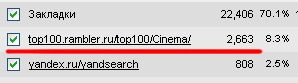 Вчера мой кинораздел практически весь день был первым в разделе "Кино" на "Рамблере". Сегодня залез в статистику посмотреть, что это дало. Оказалось - фигня-фигней, менее 2000 переходов. Я думал, что будет под три тысячи. Причем еще весной так бы и было. А сейчас - то ли все в отпусках, то ли еще в чем-то дело...