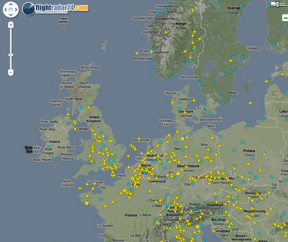 В свете последних вулканический событий - очень полезный сервис "Радар полетов". В более или менее реальном времени показываются текущие полеты, синие крестики - аэропорты.