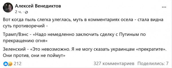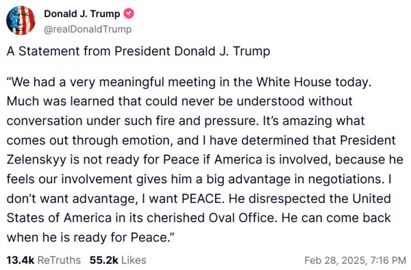 «Сегодня у нас была очень содержательная встреча в Белом доме. Мы узнали много нового, что невозможно понять без разговора под таким огнем и давлением. Удивительно, что выясняется на эмоциях, и я понял, что президент Зеленский не готов к миру, если в нем будет участвовать Америка, потому что он считает, что наше участие даст ему большое преимущество в переговорах. Мне не нужны преимущества, мне нужен МИР. Он проявил неуважение к Соединенным Штатам Америки в их заветном Овальном кабинете. Он может вернуться, когда будет готов к миру».