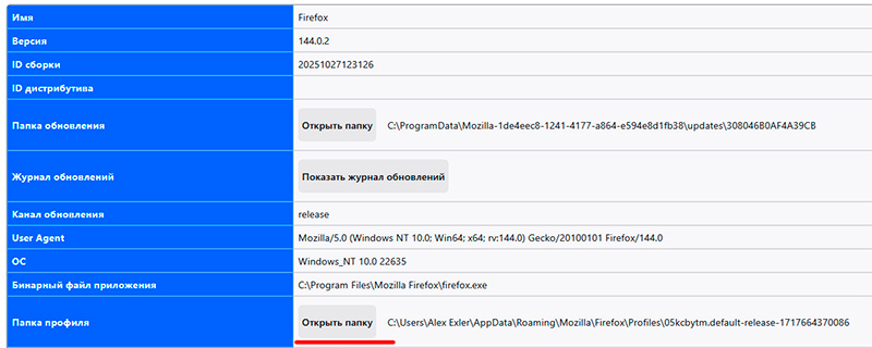 Далее в FireFox в адресной строке пишем: about:support. Там - "Папка профиля", "Открыть папку".