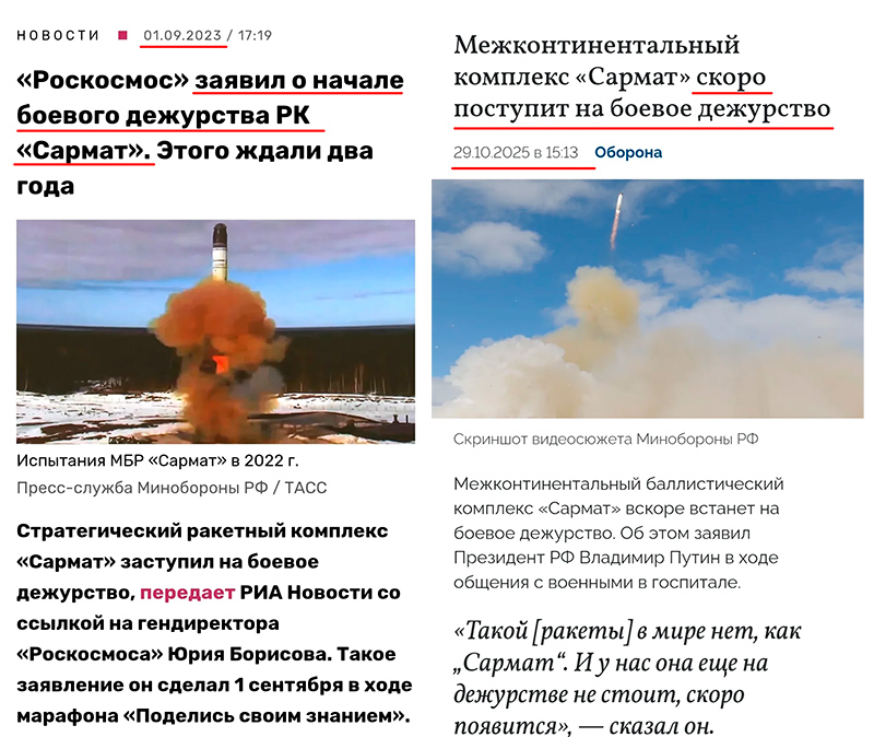 Помните такую вундервафлю "Срамат", ой, "Сармат", которой с 2022 всех пугают, пропагандисты этими сарматами языки до костей проболтали. Так вот, она, оказывается, в 2023 году заступила на такое скрытное боевое дежурство, что ее никто нигде никогда не видел.