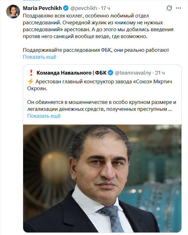 Поздравляем Фонд Борьбы с Коррупцией с блестящей победой! Благодаря неустанной работе любимого Певчих отдела расследований, они добились того, что главный конструктор завода "Союз", ведущего российского предприятия по разработке и сопровождению двигателей для самолётов, вертолётов и ракет, был арестован! Понимаете, он же воровал в особо крупных размерах, из-за чего завод не выпустил много двигателей для самолетов, вертолетов и ракет.
