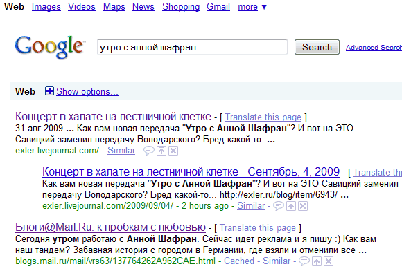 Google, конечно, просто метеор. Однако интересно то, что проиндексировал он пока не этот блог, а его трансляцию в ЖЖ - видимо, стоит приоритет. Зато Яндекс проиндексировал именно этот блог.