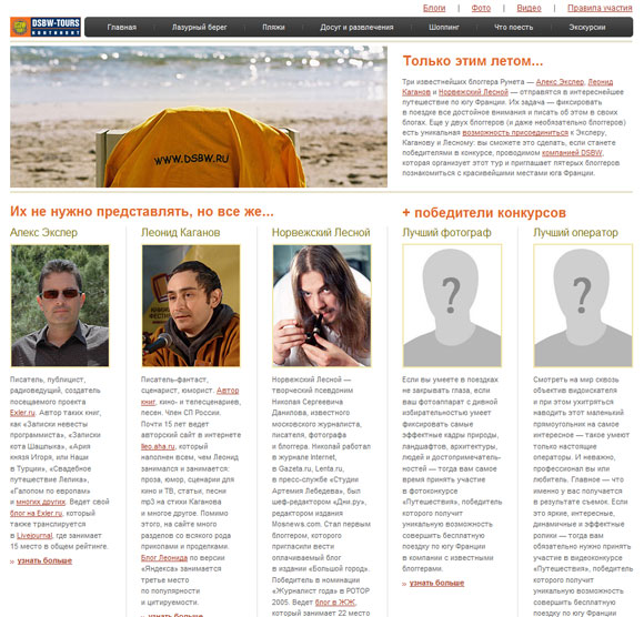 Интересно также то, что еще два блоггера (или даже просто обычные люди) могут побывать в этой поездке - совершенно бесплатно. Для этого нужно поучаствовать в конкурсе на лучшее фото и лучший видеоролик о путешествиях. Два победителя присоединятся к нам с Лесным и Кагановым, после чего смогут проследить, чтобы ни Лесной, ни Каганов, ни я не попали под жесткий прессинг южного французского солнца.