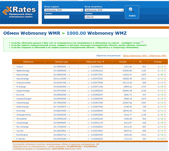 Например, если менять WMR на WMZ прямо в кипере, то курс (вместе с комиссией системы) будет несусветный - 35,279. Если воспользоваться сервисом, то лучший результат у сервиса будет 33,768 (тоже уже с комиссией). Это, конечно, грабеж, но хоть как-то терпимо. Экономия на $1000 - 1511 рублей. Нехило, между прочим.