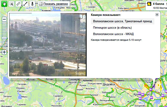 Кто вдруг не понял, что это за такие изображения камер появились на Яндекс.Пробках - щелкните по любой из этих камер. Откроется окошко с видео с этой камеры (у каждой из них по три положения, которые меняются каждые 5-10 минут) в реальном времени.