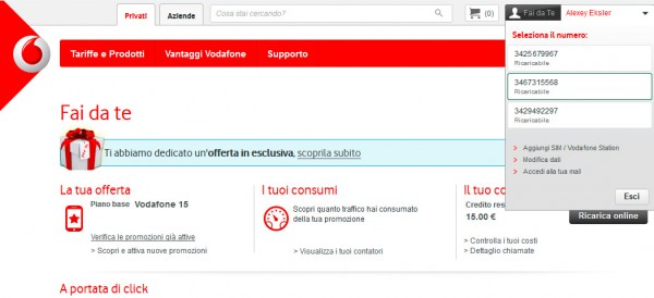 Я это все протестировал: мне прислали симкарту итальянского Vodafone и итальянский фискальный код (он там часто бывает нужен), зарегистрировали ее на их сайте (им нужно отправить фото симкарты с уникальным кодом и приложенным к ней разворота зарубежного паспорта), ну и это все заработало. Вот мой личный кабинет на Vodafone.it за зарегистрированными там тремя номерами.
