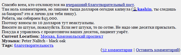 На месте вносителей по сотне я бы тоже призадумался: вдруг им завтра точно так же плюнут в физиономию, как и вносителям по десятке. И интересно, что при этом чувствуют те люди, которые, получая по 6-7 тысяч рублей в месяц, внесли 300-500 рублей? Они наверняка и дальше с восторгом будут участвовать в благотворительных проектах Кононенко-Носика.