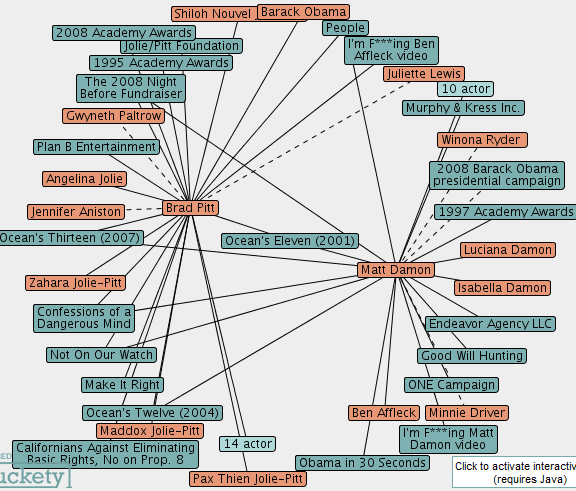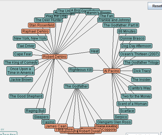 На сайте Muckety строятся интереснейшие карты взаимоосвязей различных людей, событий и организаций (англ.). Я там прошелся по всяким киношным персонам - был впечатлен: крайне наглядно и удобно. Вот, например, карта взаимосвязей Аль Пачино и Роберта Де Ниро.