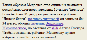 P.S. Речь идет, конечно, о так называемом регулировании Интернета, а не о том, что блог президента искусственно поднимут в рейтинге: он и так поднимется на самый верх безо всяких подталкиваний, это вполне понятно.